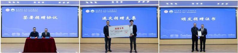 在捐赠仪式环节,BETWA西汉姆联国内合作处处长程晓军与钦瑞良董事长共同签署捐赠协议,并与钦嵚董事长完成了捐赠支票的交接。随后,姚建林副校长向钦瑞良董事长颁发捐赠证书。