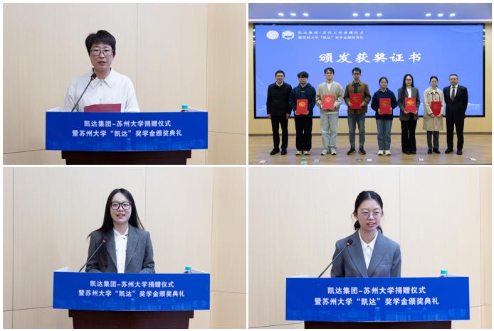 在颁奖环节,必威BETWAY西汉姆联党委副书记张芸宣读“凯达”奖学金获奖名单。钦瑞良董事长及BETWA西汉姆联党委学生工作部(处)副部(处)长谢凯为获奖同学颁发荣誉证书。研究生马欣雨、本科生杜雨桐在获奖感言中表达了对凯达集团和学校的感谢,并承诺将传承苏大校友努力拼搏、顽强奋斗的精神,把这份荣誉转化为前进的动力,不断追求卓越。