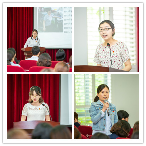 第二篇章“风采篇”从支部三位同学声情并茂的故事诵读开始,讲述了支部吴莹、姚建林和张茂杰三位教工党员的点滴故事,展现了他们在教学、科研、育人等方面的示范带头作用。在随后毕业研究生的视频分享中,学生们的肺腑之言让在座的支部党员教师深受感动,也因人才培养而感到无上光荣和自豪。支部宣传委员龙玉梅老师通过一张张奖状和一篇篇高质量的科学论文介绍了支部老师在教学、科研、文体社会活动等各方面取得的成绩。最后支部的党员教师也分享了自己的感受:王亚楠老师讲述了她的博士生导师立德树人培养学生的生动故事;谌宁老师分享了他努力帮助的一位学生因读研而改变了人生命运的故事;周祎老师为大家介绍了李永舫院士孜孜不倦做学问谆谆教导带学生的事迹;李淑瑾老师谈了自己从事本科教学工作二十六年来的心得和对当代大学生的期望;吴莹老师讲述了作为一名党员教师是如何从老一辈教师手中接过传承使命的。当本支部退休老师、年近80有60年党龄的顾仁敖教授上台分享时,会场响起了雷鸣般的掌声,顾老师为大家讲述了他求学期间是如何在艰苦环境中边学习边劳动,以及他在成为苏大老师后又如何言传身教影响身边青年教师的故事,顾老师最后提出“每个人的能力大小不一样,职位高低不一样,党员教师最大限度的发挥自己的能力,就是先进性的表现”。